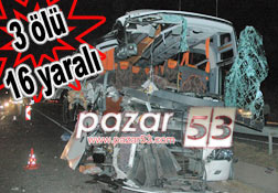 Rize Pazar'dan hareket eden yolcu otobüsü Eskişehir'de tırla çarpıştı. Kazada, ilk belirlemelere göre 3 kişi hayatını kaybetti, 16 kişi yaralandı.