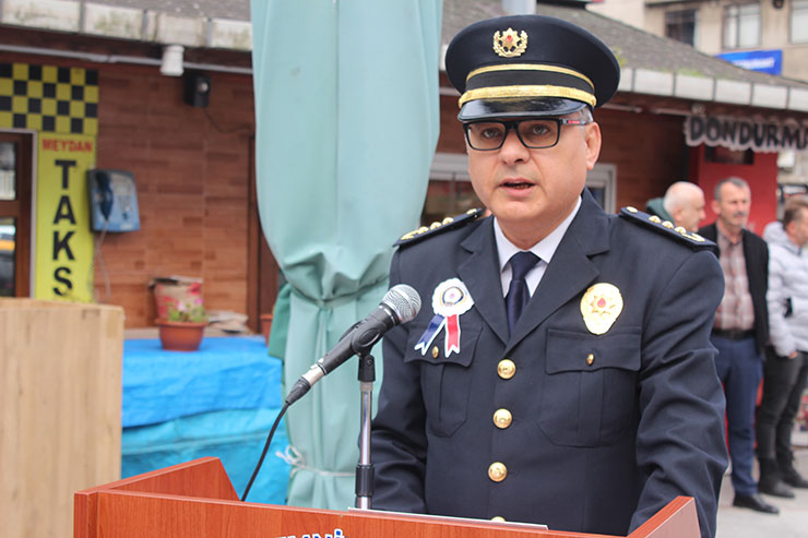 İlçe Emniyet Müdürü Ferdi Kuyu günün anlam ve önemini belirten konuşmasında şu ifadelere yer verdi: "Bugün Türk halkının sevgi ve güvenini kazanmış, Demokratik hukuk devletinin, Atatürk ilke ve inkılaplarının ve laik Cumhuriyetin teminatı olan Türk Polis Teşkilatının 179. kuruluş yıldönümü nedeniyle hepinize hoş geldiniz diyor, saygılarımı sunuyorum. Ülkemizin dört bir yanında "güven ve huzurun" hâkim olması için büyük bir gayret, üstün bir performans ve kararlı bir irade ortaya koyan Emniyet Teşkilatımız, 179 yıldır milletimizin daima yanında ve emrindedir. Üzerimize düşen sorumluluğu layıkıyla yerine getirme gayesiyle, birikimimiz, tecrübemiz, donanımımız ve kabiliyetimiz çerçevesinde suç ve suçlularla mücadelemizi kesintisiz bir şekilde sürdürmekteyiz. Temel hak ve özgürlüklere saygılı, hukukun üstünlüğüne bağlı bir anlayışla sürdürdüğümüz bu mücadelede hiç şüphe yok ki en büyük dayanağımız aziz milletimizdir. Gerek beşeri, gerek fiziki ve teknik kapasitesi itibariyle gücünün zirvesinde olan Teşkilatımız, güvenli geleceğe karşı sorumluluğunu yerine getirmek için gereken adımları tereddütsüz atmakta ve her alanda "sıfır kayıp" ilkesi ile hareket etmektedir. Hiç şüphesiz ki, devletimizin ve milletimizin bize sunduğu bu imkanları en verimli şekilde kullanmak, en üst seviyede güvenlik hizmeti sunmak ve milletimizin bize olan teveccühüne layık olmak, bizim için hem bir görevdir, hem de bir onur vesilesidir. Türk Polis Teşkilatı olarak terör, uyuşturucu ve organize suçlarla mücadele, genel asayişin ve trafik düzeninin sağlanması ve suçu önleyici tedbirlerin alınması noktasında çalışmalarımızı kararlılıkla sürdürürken, doğal afetler sonrasında da arama-kurtarma faaliyetleri, hayatın normale dönmesi ve asayiş ortamının sağlanmasında da sahada büyük bir gayret ortaya koymaktayız. Bu duygu ve düşüncelerle başta Gazi Mustafa Kemal Atatürk ve silah arkadaşları olmak üzere bu ülke için canlarını feda eden aziz şehitlerimizi saygı, minnet ve şükranla anıyor, kahraman gazilerimize sağlıklı uzun ömürler diliyor, ülkemizin dört bir yanında canla başla görev yapan siz değerli meslektaşlarıma ve kıymetli ailelerinize Teşkilatım ve şahsım adına en derin şükranlarımı sunuyorum. Cumhuriyetimizin 2. Yüzyılında, şan ve şerefle dolu iki asra yaklaşan mazisinin gururunu taşıyan Teşkilatımızın 179. Yılı kutlu olsun"