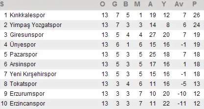 Türkiye 2. Futbol Ligi B Kategorisi 4. Grup'ta oynanan maçlarda Erzurumspor, kendi sahasında Giresunspor ile 4–4 berabere kalırken, Kırıkkalespor konuk ettiği Arsinspor'u 3-2 yendi. Y. Yozgatspor deplasmanda Erzincanspor’u 2-1, Ünyespor ise evinde Tokatspor’u 1-0 mağlup etti. Pazarspor’un da evinde Kırşehir’e 2-1 mağlup olduğu 13. haftada oynanan 5 karşılaşmanın ikisinde ev sahibi ekipler, ikisinde deplasman takımları galip gelirken bir karşılaşma da beraberlikle sonuçlandı. Ligde son beş haftaya girilirken gelecek hafta şu karşılaşmalar oynanacak: Erzincanspor - Pazarspor, Y. Kırşehirspor - Ünyespor, Tokatspor - Erzurumspor, Giresunspor - Kırıkkalespor ve Y. Yozgatspor - Arsinspor.