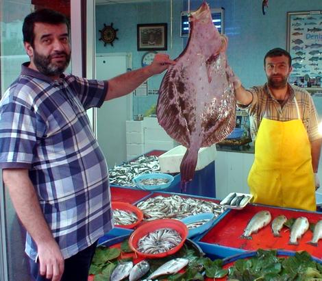 Havaların sıcak gitmesi nedeniyle palamut ve hamsi balıkçı tezgâhlarına giremeyince, ağa takılan 8,5 kiloluk dev kalkan balığı 200 YTL’den müşteri bekliyor.
