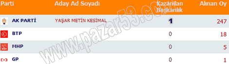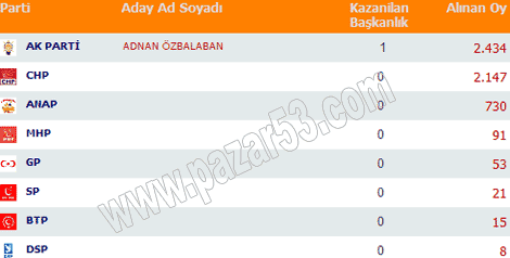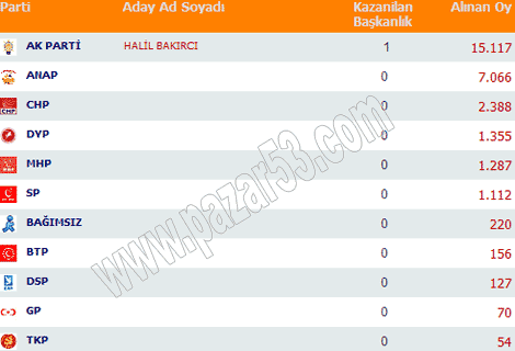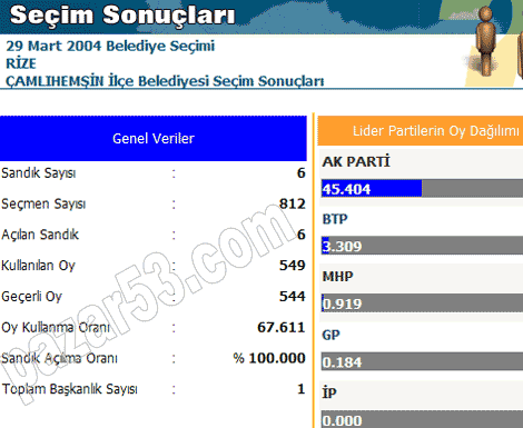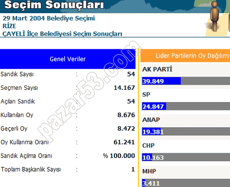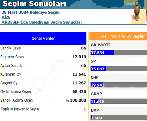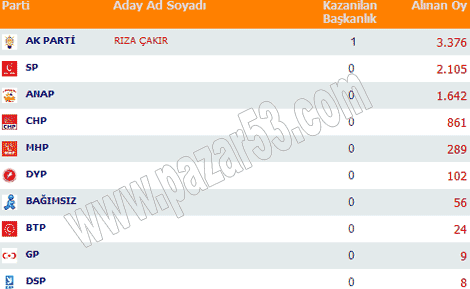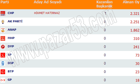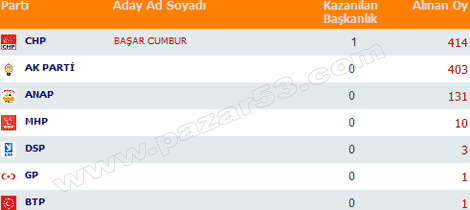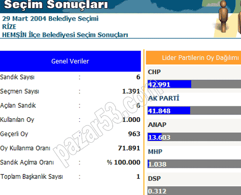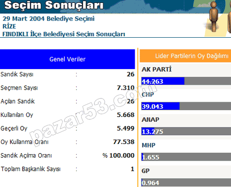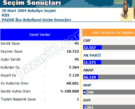 Rize, Pazar, Ardeşen, Çayeli, Fındıklı, Hemşin ve Çamlıhemşin'de siyasi partilerin 2004 belediye seçimlerinde aldıkları oyların dağılımı: