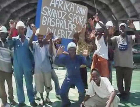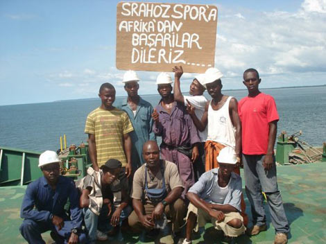 Görüntüde bir grup Afrikalı genç ellerinde "Afrika'dan Srahozspor'a Başarılar Dileriz" yazı bir pankart ile Srahozspor için tezahüratta bulunuyorlar.