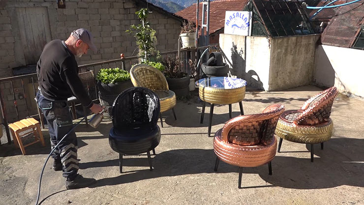 RİZE (İHA) - Rize’de emeklilikten sonra kendisine ahşap işlerini uğraş olarak seçen vatandaş, yeni arayışlar içerisine girince atıl duruma düşmüş araba tekerleklerinden koltuk takımı yapmaya karar verdi ve o takımda komşularını ağırlamaya başladı.