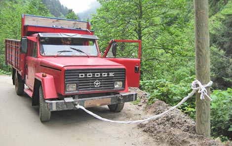 Ayder yaylası Galer düzlüğünde bir kamyonetin halatla ağaca bağlanması görenlerin ilgisini, çekti.