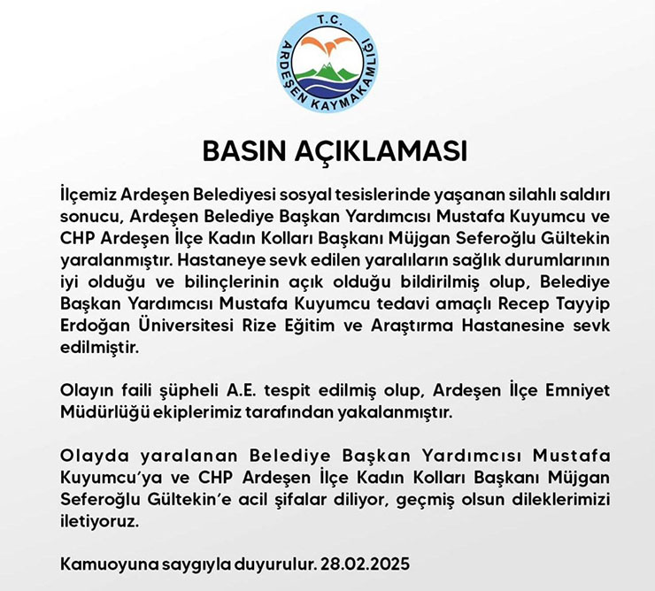 Açıklamada, "Ardeşen Belediyesi sosyal tesislerinde yaşanan silahlı saldırı sonucu, Ardeşen Belediye Başkan Yardımcısı Mustafa Kuyumcu ve CHP Ardeşen İlçe Kadın Kolları Başkanı Müjgan Seferoğlu Gültekin yaralanmıştır. Hastaneye sevk edilen yaralıların sağlık durumlarının iyi olduğu ve bilinçlerinin açık olduğu bildirilmiş olup, Belediye Başkan Yardımcısı Mustafa Kuyumcu tedavi amaçlı Recep Tayyip Erdoğan Üniversitesi Rize Eğitim ve Araştırma Hastanesine sevk edilmiştir. Olayın faili şüpheli A.E. tespit edilmiş olup, Ardeşen İlçe Emniyet Müdürlüğü ekiplerimiz tarafından yakalanmıştır. Olayda yaralanan Belediye Başkan Yardımcısı Mustafa Kuyumcu'ya ve CHP Ardeşen İlçe Kadın Kolları Başkanı Müjgan Seferoğlu Gültekin'e acil şifalar diliyor, geçmiş olsun dileklerimizi iletiyoruz" ifadelerine yer verildi.