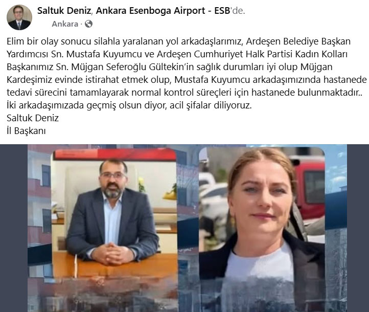 CHP Rize İl Başkanı Saltuk Deniz de Ardeşen Belediye Başkan Yardımcısı Mustafa Kuyumcu ile CHP Ardeşen İlçe Kadın Kolları Başkanı Müjgan Seferoğlu Gültekin'in yaralandığı silahlı saldırıya ilişkin sosyal medya hesabından açıklamalarda bulundu: