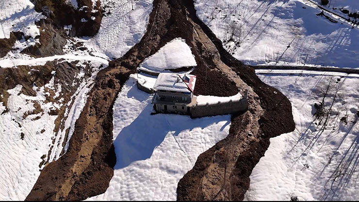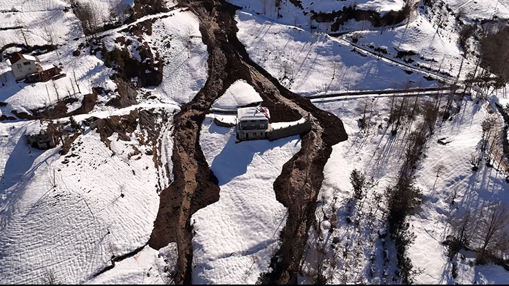 Heyelan geçtiğimiz gün akşam saatlerinde Ardeşen ilçesine bağlı Aşağı Durak Köyü’nde meydana geldi. Karın erimesiyle yumuşayan toprak tepeden koparak heyelan olarak köyün içerisinden aktı. Balçığa bulanan köyde 4 ev Ardeşen Kaymakamlığı tarafından tedbir amaçlı taliye edilirken 6 ev heyelandan zarar gördü. Heyelanın başladığı noktada bulunan bir evin ise 2 yanından da balçık aktı. Evin arka kısmında bulunan çay bahçesinin zeminin sağlam olması balçığın akarını 2’ye bölerek yönünü değiştirdi. Bu sayede evin büyük bir kısmı balçık nedeniyle hasardan korunurken bir kısmında hasar oluştu. Öte yandan evin çevresi ve çevresindeki tarım arazileri heyelan nedeniyle ciddi anlamda zarar gördü. Drone ile havadan görüntülenen bölge ise felaketin boyutunu ortaya serdi.