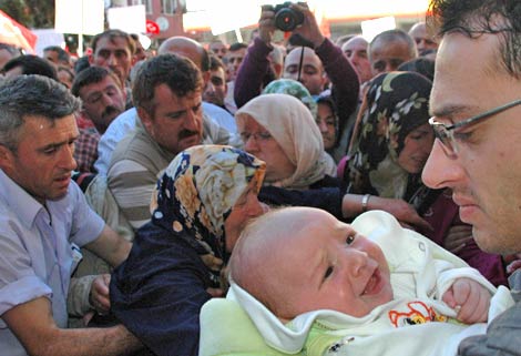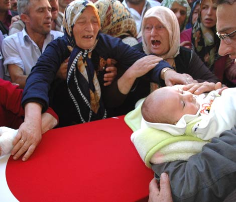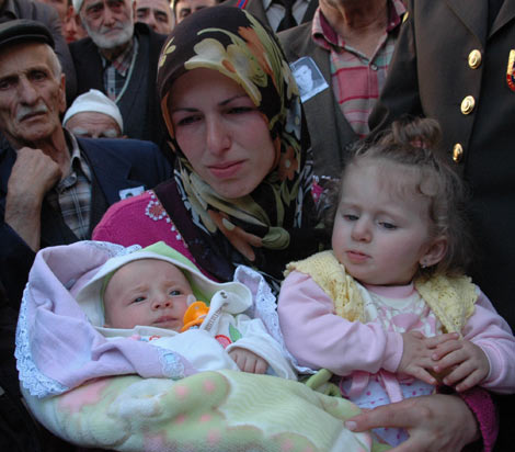 Şehit askerin, çocuğuna şehit olan arkadaşı Mert'in ismini koyduğu ve hiç görmediği 40 günlük bebeği tabutunun başına getirildi.