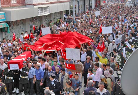 Şehit jandarma er Muhammet Aydemir'in tören alanına getirilen tabutuna sarılan annesi Nazmiye hanım ve eşi Fatma Aydemir uzun süre gözyaşı döktü.
