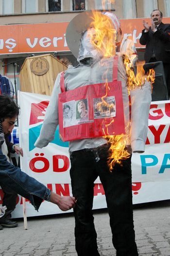 Artvin'de çeşitli siyasi görüşlere mensup vatandaşlar, Atapark önünden başlayıp sloganlar eşliğinde yürüyerek otopark önüne geldi. Yaklaşık bin kişilik grup, ABD'nin Irak'ı işgalini protesto ederek ABD Başkanı Bush'un maketini gaz döküp yaktı, ABD aleyhinde slogan attı.