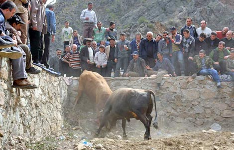 Boğa güreşleri ile ünlü Artvin'de sezonun ilk müsabakaları Yusufeli ilçesi Sarıgöl köyünde yapıldı.