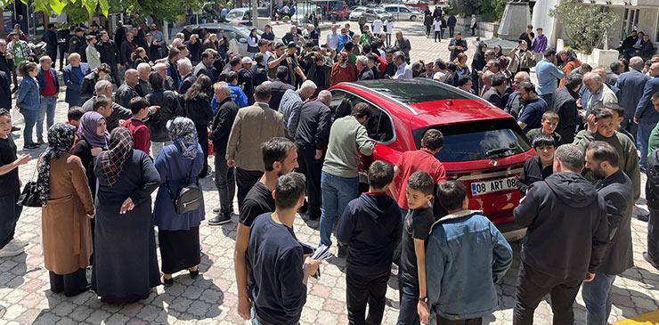 Artvin Valiliği önüne getirilen "Anadolu kırmızısı" rengindeki otomobile ilgi gösteren vatandaşlar hatıra fotoğrafı çektirdi.