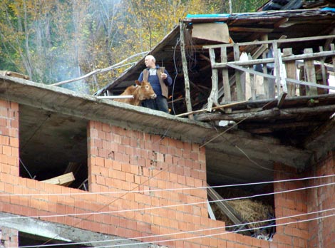 Artvinli emekli öğretmen Burhan Kırdar, 11 katlı ilginç binanın çatı katında inekleri, 8. katında ise kendisi kalıyor. İnekler için teleferik bile var!