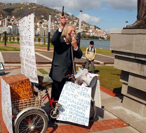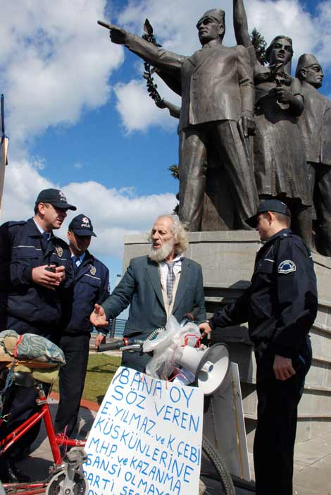 Üzerinde haksızlığa uğradığını anlatan pankartların bulunduğu bisikletiyle İlk Adım Anıtı önüne gelen Nurettin İslam, bir elinde megafon, bir elinde telefon Atatürk'ü aradı.