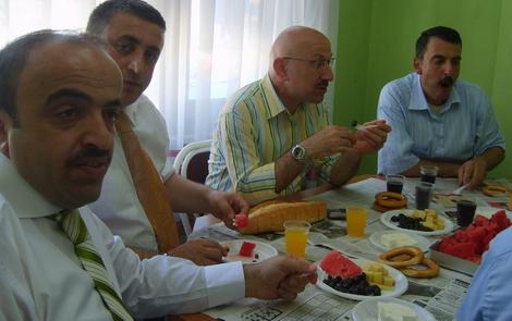 Sıcağın etkisiyle yorulan Bayramoğlu ve ekiptekiler Ak Parti Pazar İlçe Binasında karpuz ve beyaz peynir yedikten sonra çalışmalarını devam ettirdiler.