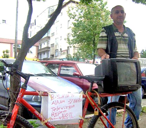 Ardeşenli vatandaş, krizden etkilendiğini belirterek bisikletini satışa çıkardı. Promosyon olarak da 37 ekran televizyonunu veriyor!