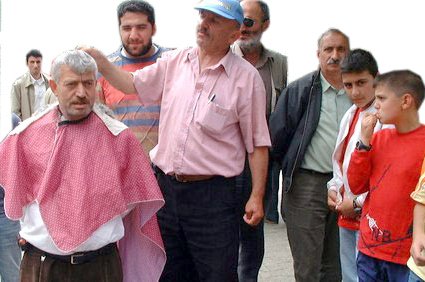 Pazar ilçesinde 2 liraya piyasaya sürdüğü jiletli tarağını satmak için sokak ortasında tıraş yapan seyyar berber, halkın ilgi odağı oldu...
