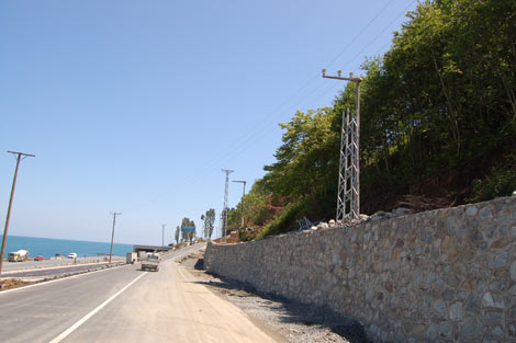 Rizenin Pazar ilçesine revizyon edilerek yapılan yeni giriş yolundaki istinat duvarı üzerine dikilen demir direk ve çekilen teller çirkin bir görüntü oluşturuyor.
