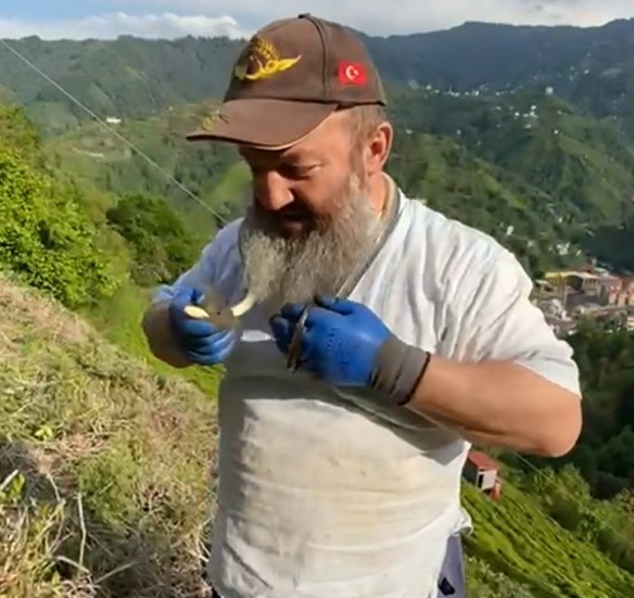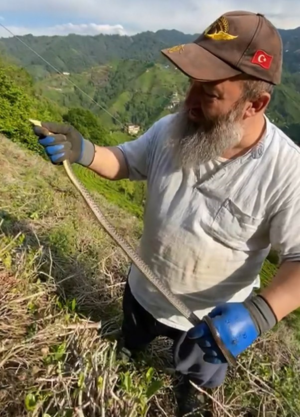 Rize'nin Çayeli ilçesine bağlı Büyükköy Beldesi'nde yaşayan Ali Dilmaç isimli çay müstahsili, önümüzdeki günlerde açılması beklenen çay sezonuna hazırlık için tarlasına girerek bakımlarını tamamlamak istedi. Tarlasında yabani otları temizleyen Dilmaç, otların arasında kıvrılan yılanı fark ederek zarar vermeden yakaladı. Halen hayatta olan yılanın nasıl bir şey olduğunu anlatan Dilmaç'ın yanında bulunan yakını ise o anları cep telefonu kamerası ile kaydetmeye başladı.