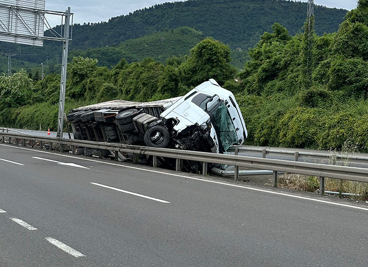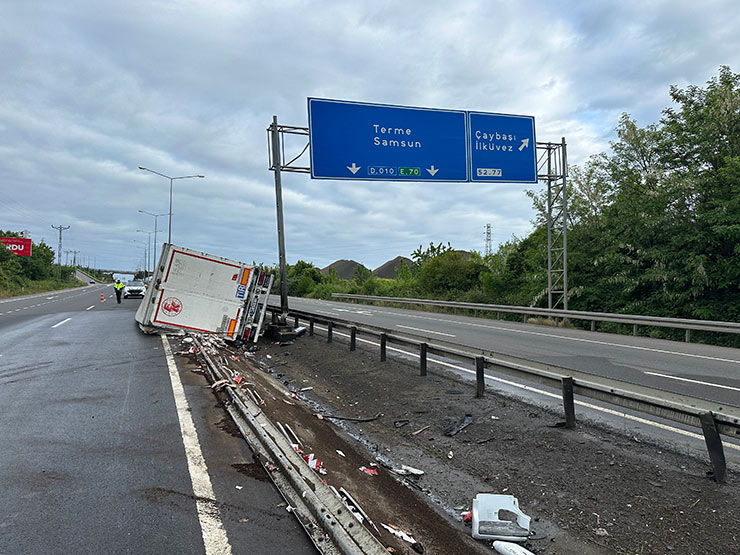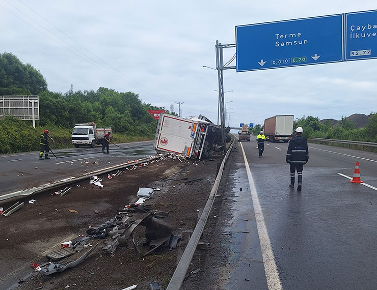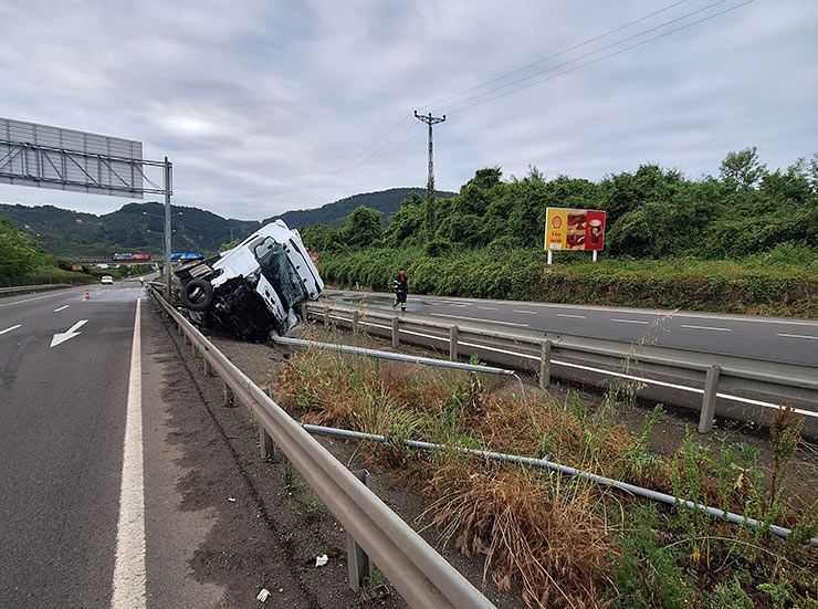 Edinilen bilgiye göre, Rize’den İstanbul’a çay sevkiyatı yaptığı öğrenilen Kenan Katip (53) yönetimindeki 53 ADR 474 plakalı tır, sürücüsünün direksiyon hakimiyetini kaybetmesi sonucu orta refüjdeki bariyerlere çarptı. Çarpmanın etkisiyle sola devrilen tır sürücüsü kabin içerisinde sıkıştı.