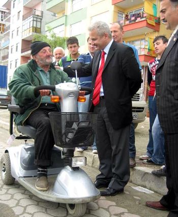 Çayeli Belediyesi hayırseverler aracılığıyla temin edilen 3 adet özel akülü-şarjlı sakat arabalarını ihtiyaç sahiplerine teslim etmeye başladı. Araçlardan ilki, 7 yıl önce geçirdiği hastalık sonucu bir ayağı kesilmek zorunda kalan Ahmet Şişman’a verildi.