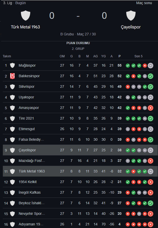 TFF 3. Lig 2. Grup 27. hafta maçında Smart Holding Çayelispor, deplasmanda Türk metal 1963 takımı ile 0-0 berabere kaldı