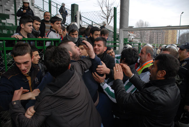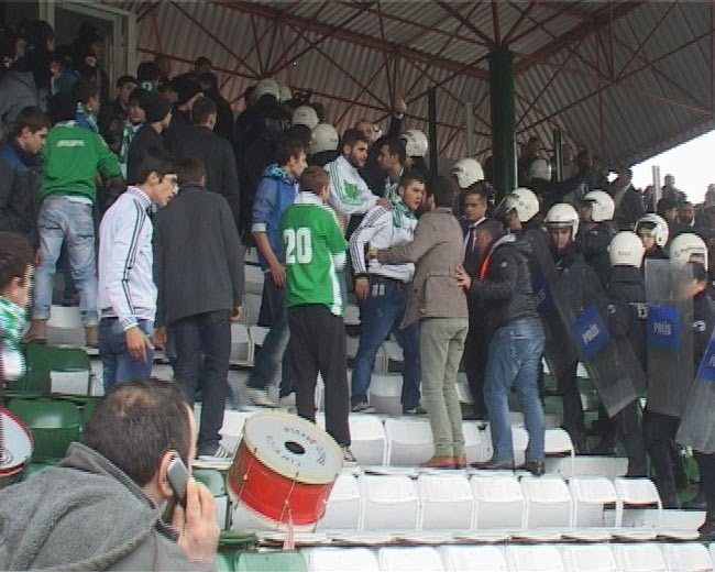 Maçın başladığı sırada iki rakip takım taraftarları arasında başlayan sözlü tartışma fiziksel müdahaleye dönüştü.