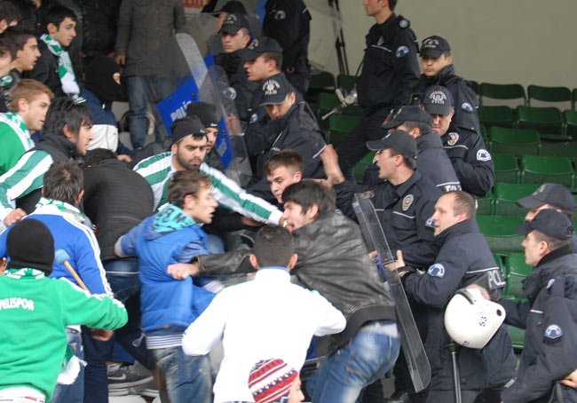 Taraftarlar birbirine koltuk fırlattı. Bazı taraftarlar iki takım taraftarlarını ayıran tel örgüleri aşmaya çalıştı.
