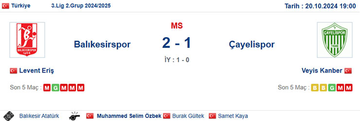 TFF 3. Lig 2. Grup 7. hafta maçında Smart Holding Çayelispor, deplasmanda Balıkesirspor'a 2-1 mağlup oldu.