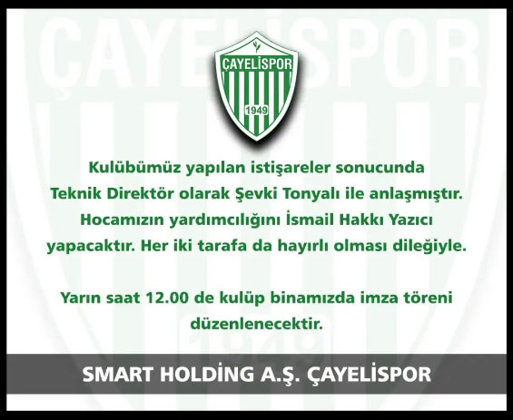 Çayelispor yönetimi, Pazarspor’u 2 kez şampiyon yaparak 2. Lig’e yükselten Şevki Tonyalı ile anlaşmaya vardı. Şevki Tonyalı 2017-2018 sezonunda da Çayelispor’u çalıştırmıştı.