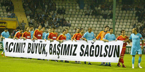Ç.Rizesporlu futbolcular sahaya Acımız büyük, başımız sağ olsun pankartıyla çıktı.