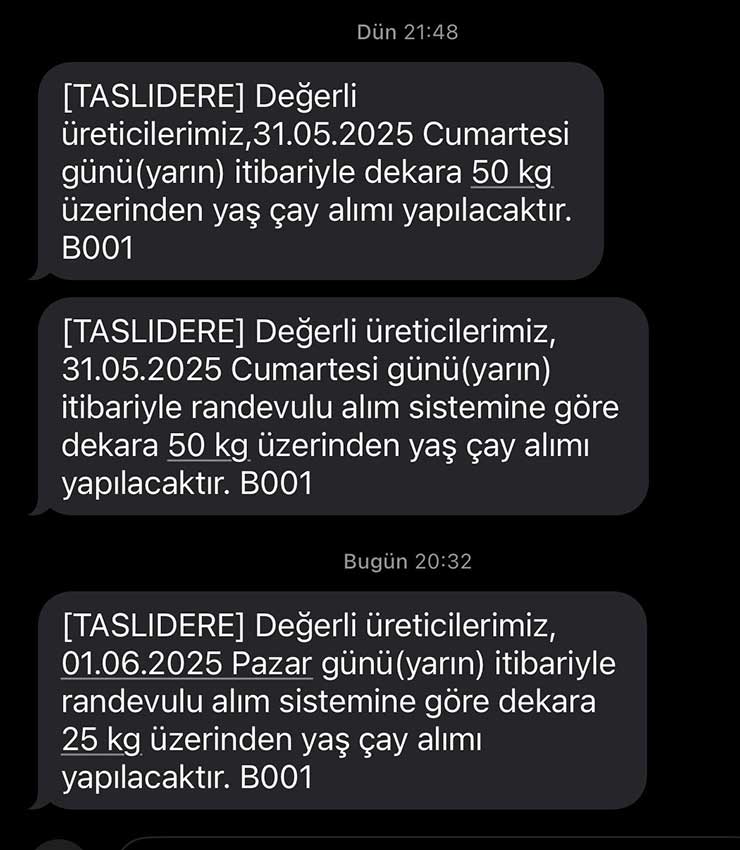 ÇAYKUR üreticilere gönderdiği kısa mesajla kontenjan uygulamasına geçildiğini ardından kontenjanın dekara 25 kilograma düşürüldüğünü duyurdu.