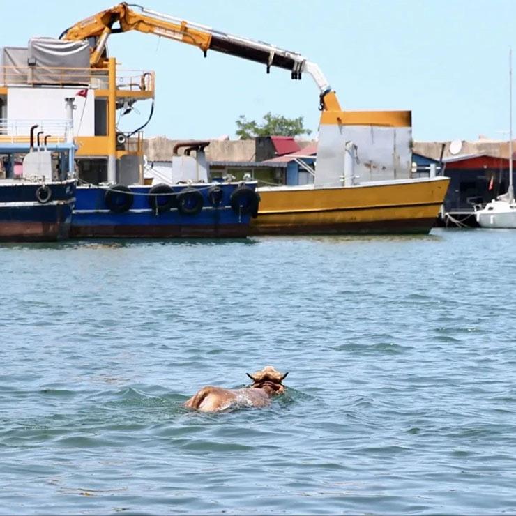 Kamyonetten indirildiği sırada sahibinin elinden kaçarak denize atlayan kurbanlık büyükbaş hayvan, balıkçı kulübesinde yakalandı.