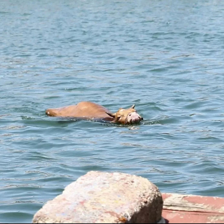 Yaklaşık 20 dakika suda kalan kurbanlık, karaya çıkıp bir balıkçı kulübesine sığındı.