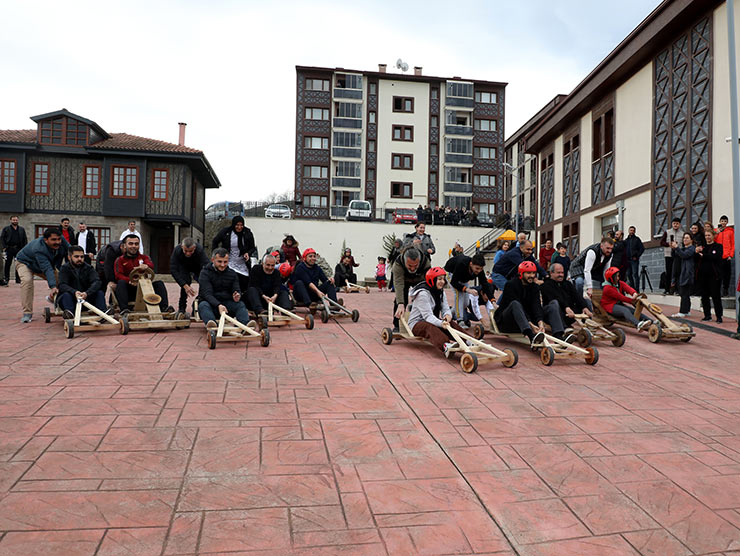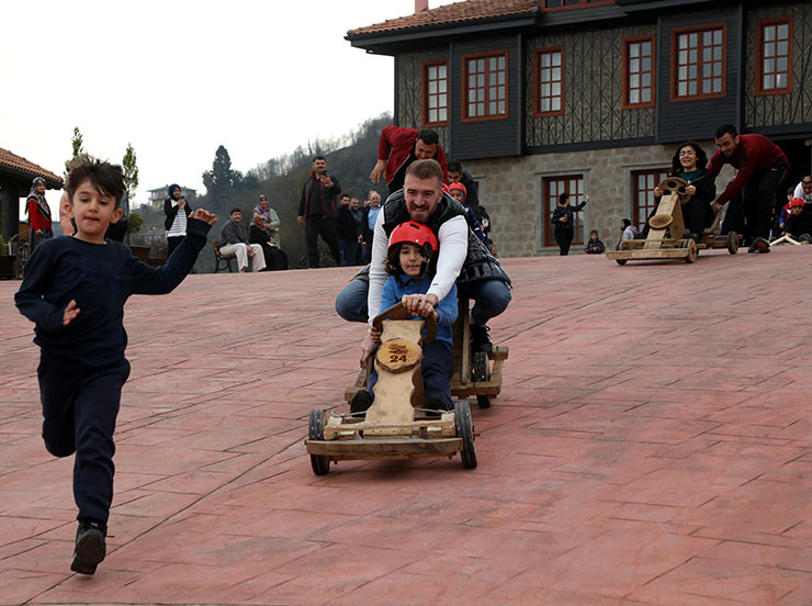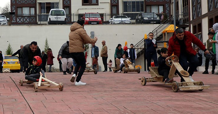 Çocukların yarışına, babaları tahta arabaları iterek destek verdi. Büyükler de bir süre tahta arabalara binerek çocukluklarına döndü.