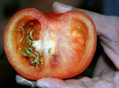 Aşırı derecede hormon kullanıldığı belli olan domateslerin çekirdeklerinde yaklaşık 8-10 santimetre uzunluğunda fideler çıktı. Domatesleri yemeyen vatandaşlar, yetkililerin gıdaları daha çok denetlemesini istedi.