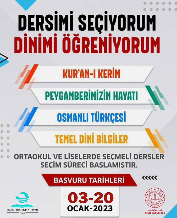 Din, Ahlak ve Değerler başlığı altındaki “Kur’an-ı Kerim, Peygamberimizin Hayatı, Temel Dini Bilgiler ve Osmanlı Türkçesi” derslerini seçme sürecinin ocak ayında sona ereceği belirtildi.