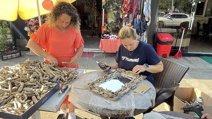 Ürünlerinde doğadan topladıkları ağaç parçaları, kozalak, taş ve deniz kabuğu gibi malzemeleri kullanan Karamahmutoğlu, Bekar ve Altunsoy, satışı da atölyelerinde yapıyor.