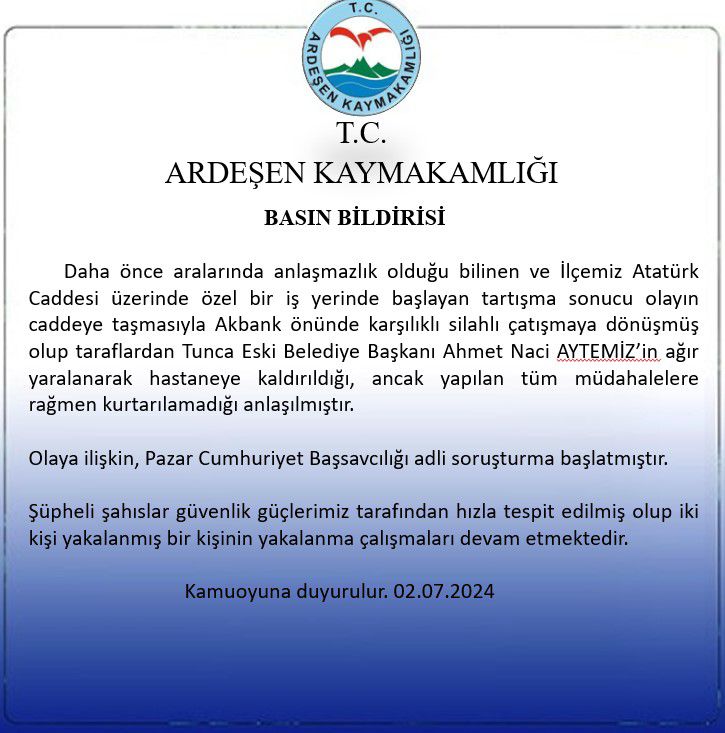 Rize'nin Ardeşen ilçesinde çıkan silahlı kavgada eski Tunca Belde Belediyesi Başkanı Ahmet Naci Aytemiz hayatını kaybetti.
