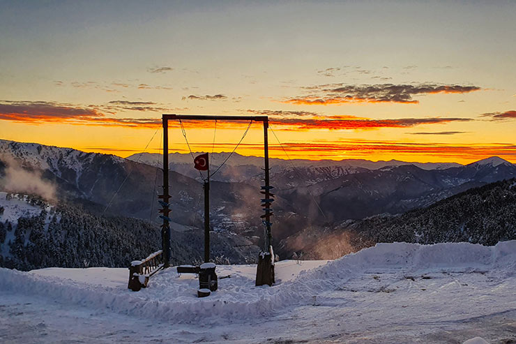 Yağan karla birlikte beyaz gelinliğini giyen ve karın en çok yakıştığı yerlerden birisi olan Zigana Dağı, akşam saatlerinde kış güneşinin ufuk çizgisine inerken gökyüzünü boyadığı muhteşem renklerle bezeniyor.