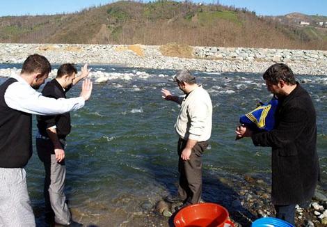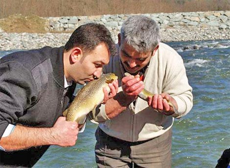 Balıklar suya bırakılmadan önce Mevlut Ali Biber ve Adem Çatan'ın balıkları doyasıya öpmeleri izleyenleri duygulandırdı. Biber ve Çatan, balıkları bıraktıktan sonra da arkalarından el salladı.