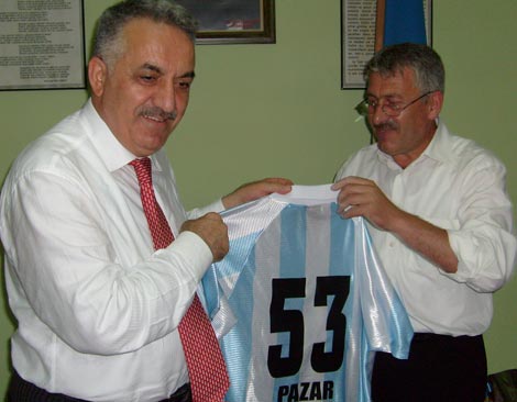 Pazarspor Yönetim Kurulu üyeliği görevinde de bulunan Abdullah Uzun, Yazıcı'ya bir de Pazarspor forması hediye etti.