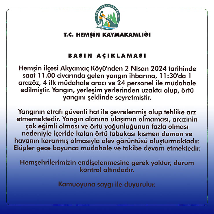 Yangınla ilgili Hemşin Kaymakamlığı'ndan da bir açıklamada bulunuldu. Yapılan açıklamada, yangının kontrol altına alındığı ifade edilerek, "Hemşin ilçesi Akyamaç Köyü'nden 2 Nisan 2024 tarihinde saat 11.00 civarında gelen yangın ihbarına, 11:30'da 1 arazöz, 4 ilk müdahale aracı ve 24 personel ile müdahale edilmiştir. Yangın, yerleşim yerlerinden uzakta olup, örtü yangını şeklinde seyretmiştir. Yangının etrafı güvenli hat ile çevrelenmiş olup tehlike arz etmemektedir. Yangın alanına ulaşımın olmaması, arazinin çok eğimli olması ve örtü yoğunluğunun fazla olması nedeniyle içeride kalan örtü tabakası kısmen duman ve havanın kararmış olmasıyla alev görüntüsü oluşturmaktadır. Ekipler gece boyunca müdahale ve takibe devam etmektedir. Hemşehrilerimizin endişelenmesine gerek yoktur, durum kontrol altındadır." denildi.