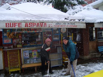Sabah günün ilk ışıklarıyla işyerlerine yönelen esnaf ise gece devam eden kar yağışından kapanan dükkanlarının önünü kürediler.