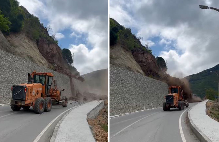 Olay sırasında bölgede yol temizleme çalışması yapan Karayolları’na ait iş makinesi, operatörünün heyelanın gelinişi fark etmesi sayesinde saniyelerle kurtuldu. Toprağın kaydığı anlar ise bir vatandaşın cep telefonu kamerasına yansıdı.