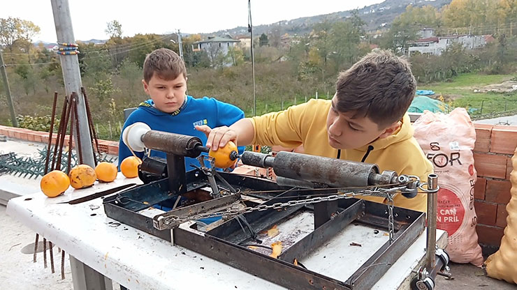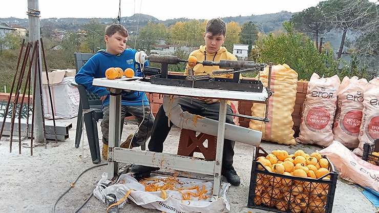 Çuvallar dolusu hurmaları elleriyle tek tek soyan anne ve babalarının zorlandığını gören Muhammet Mert ve Miraç Efe, bunun makineyle daha kolay yapılabileceği fikrini babalarıyla paylaştı.
