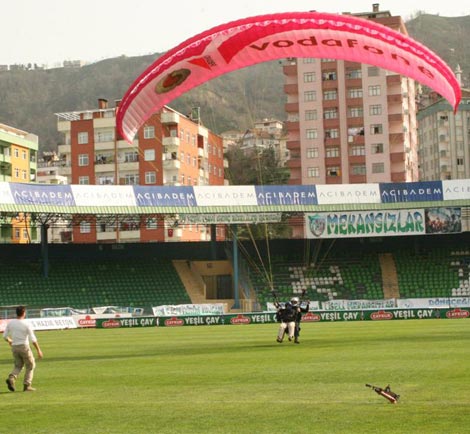 Rize Belediye Başkanı Halil Bakırcı Dağbaşı mevkiinden bindiği paraşütle şehrin üstünde bir tur attıktan sonra Rize Atatürk Stadyumuna indi.