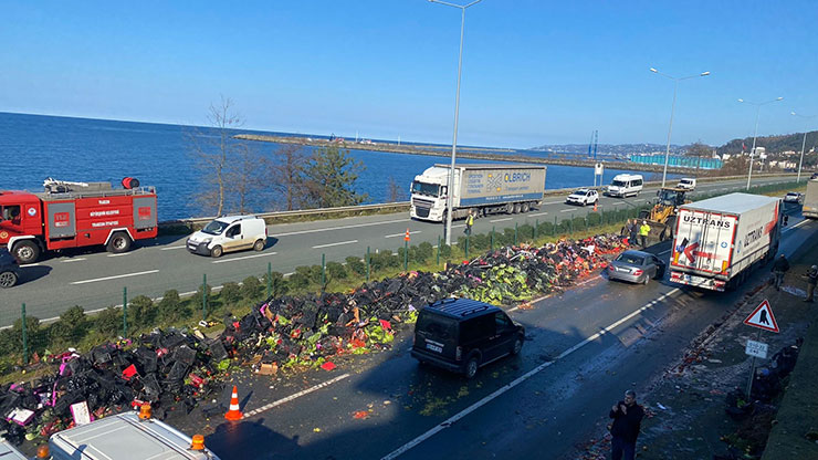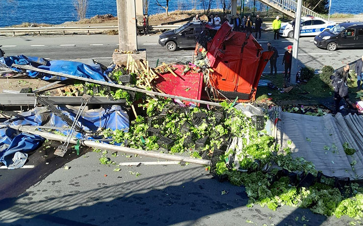 Öte yandan, kaza sonrası tırın dorsesinde bulunun sebzelerin karayoluna savrulması nedeniyle uzun kuyruklar oluştu. Polis ekipleri ve çevredeki vatandaşların yardımıyla yola savrulan sebzeler temizlenerek karayolu kontrollü olarak trafiğe açıldı.