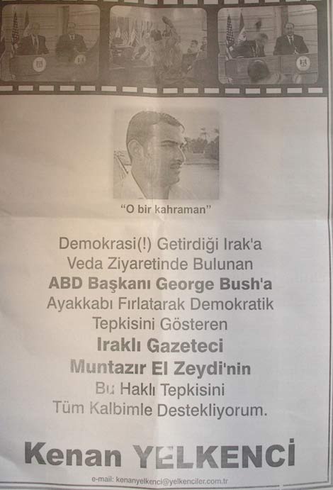 Rizeli işadamı Kenan Yelkenci, mahalli gazetelere verdiği tam sayfa ilanlar ile Iraklı Gazeteci Muhtazır El Zeydi'nin ABD Başkanı George W. Bush'a ayakkabı fırlatmasına destek verdi.