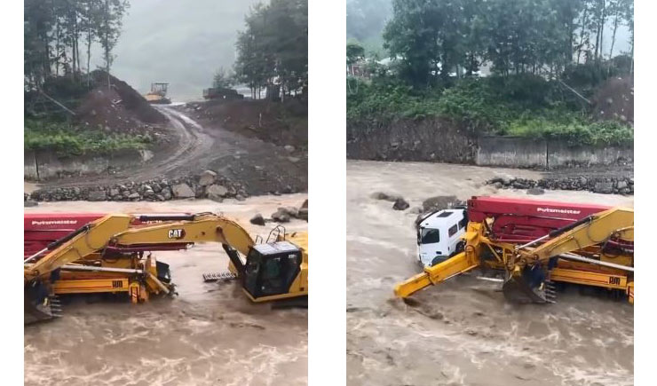 Bu sırada dere yatağında çalışan bir beton pompası ve bir ekskavatör, yükselen suyun ortasında kaldı.